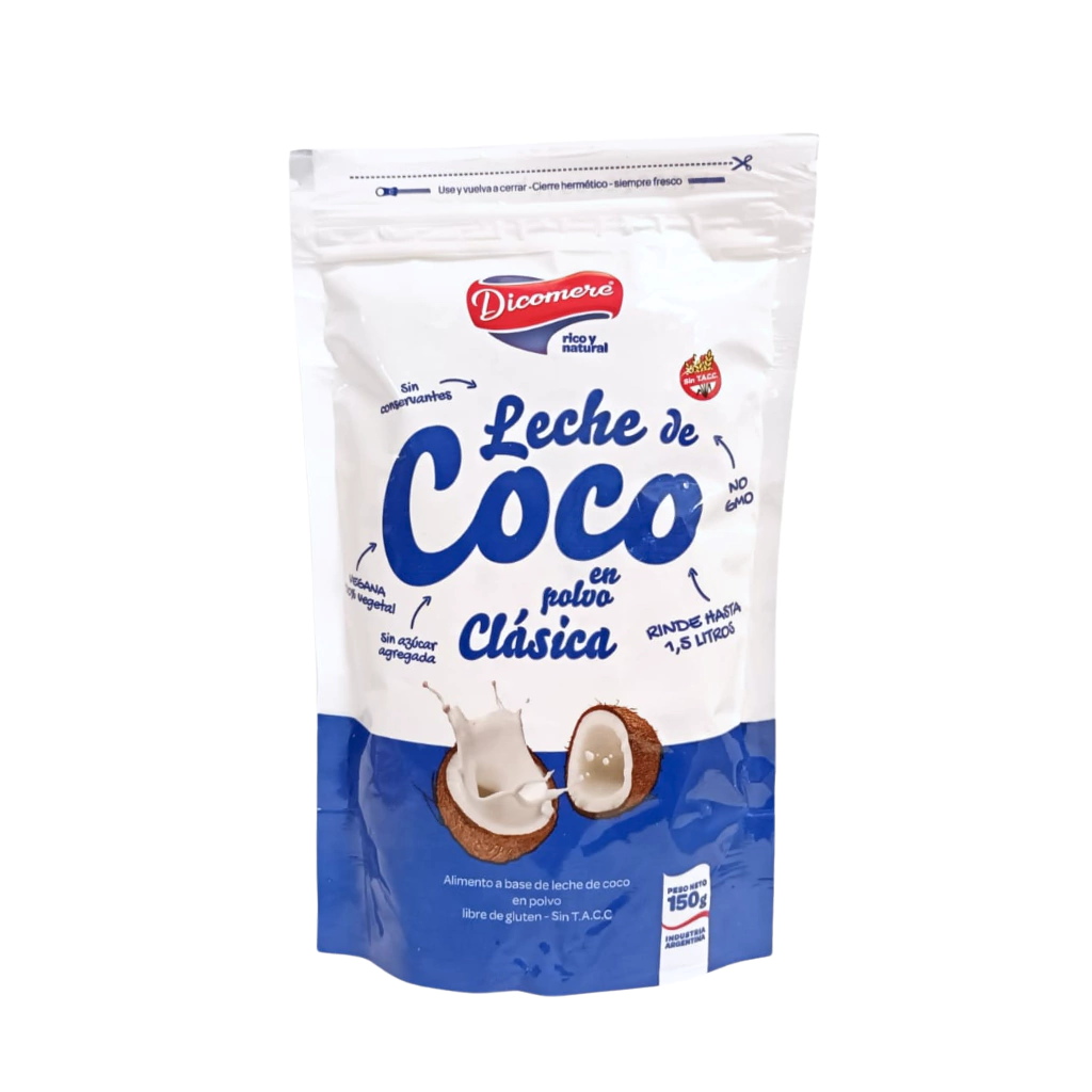 Por cada 200 ml de agua templada o caliente, agregar 2 cucharadas soperas (20 gs. aprox) de leche de coco en polvo Dicomere.