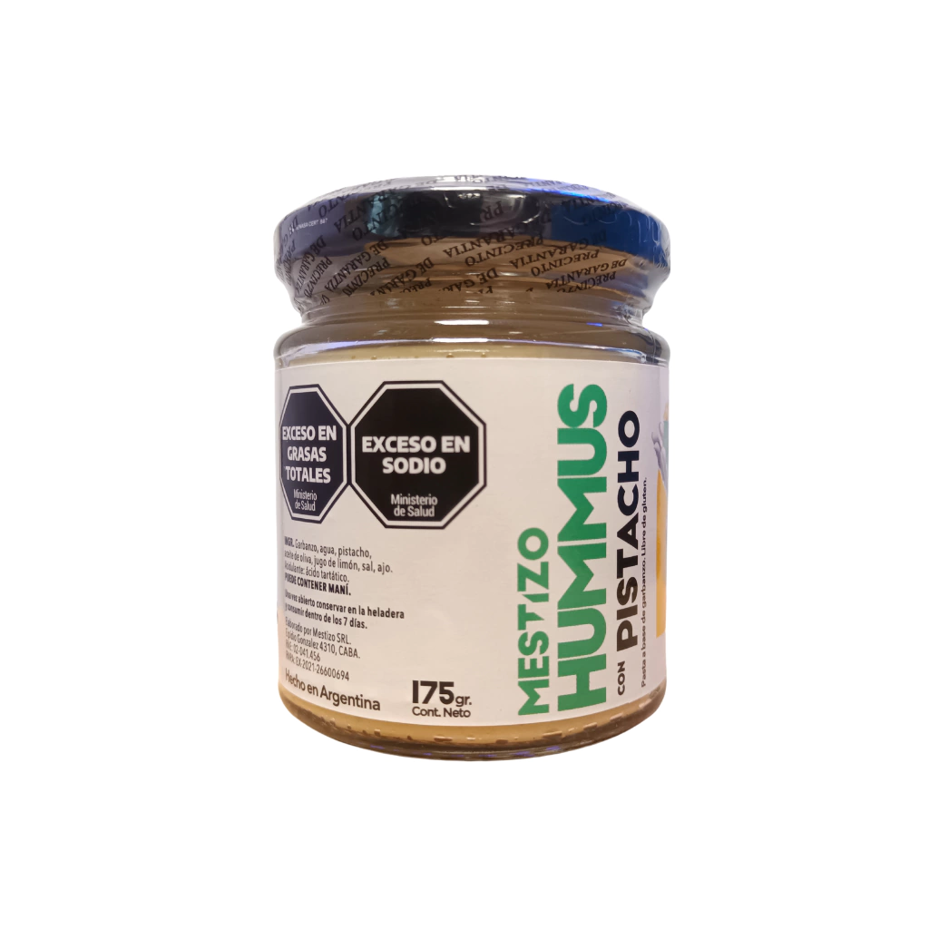 Ingredientes: garbanzo, agua, pistacho, aceite de oliva, jugo de limón, sal, ajo. Acidulante: ácido tartático.